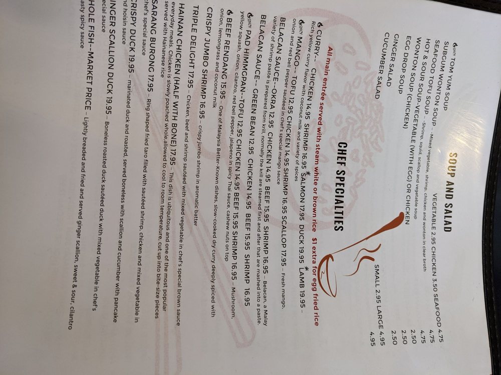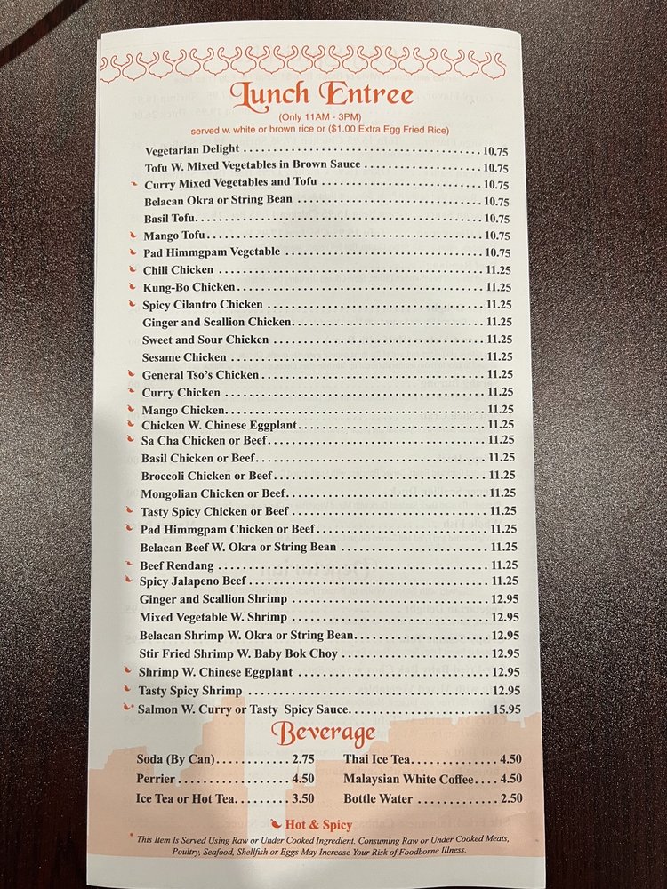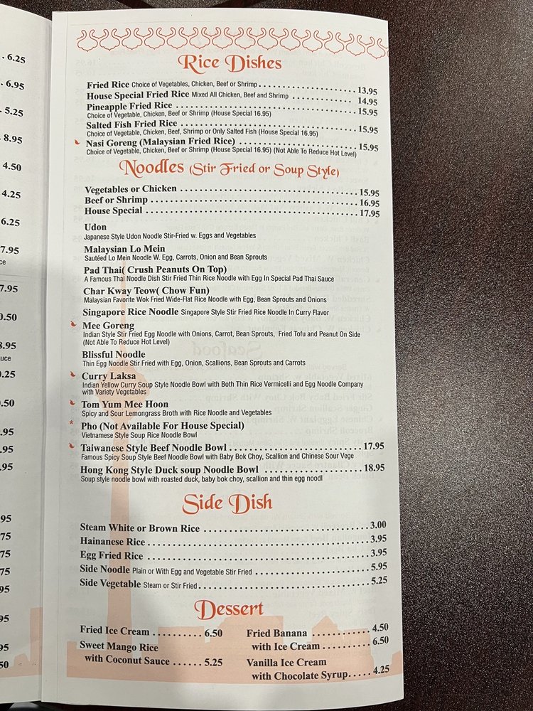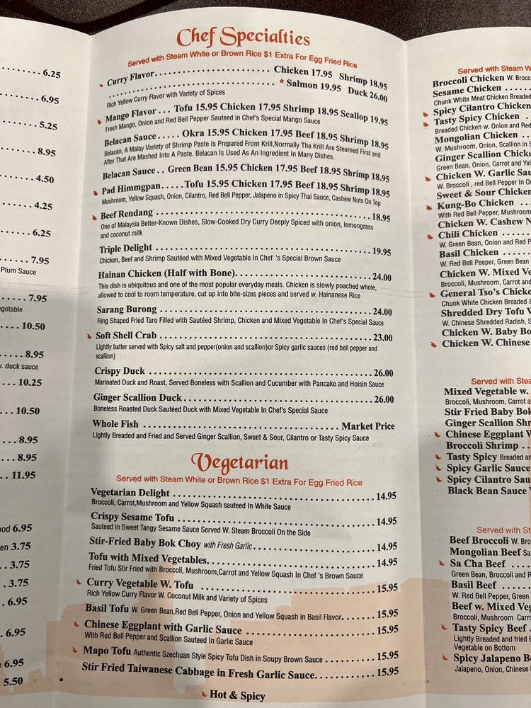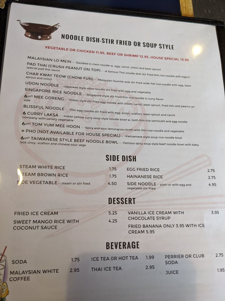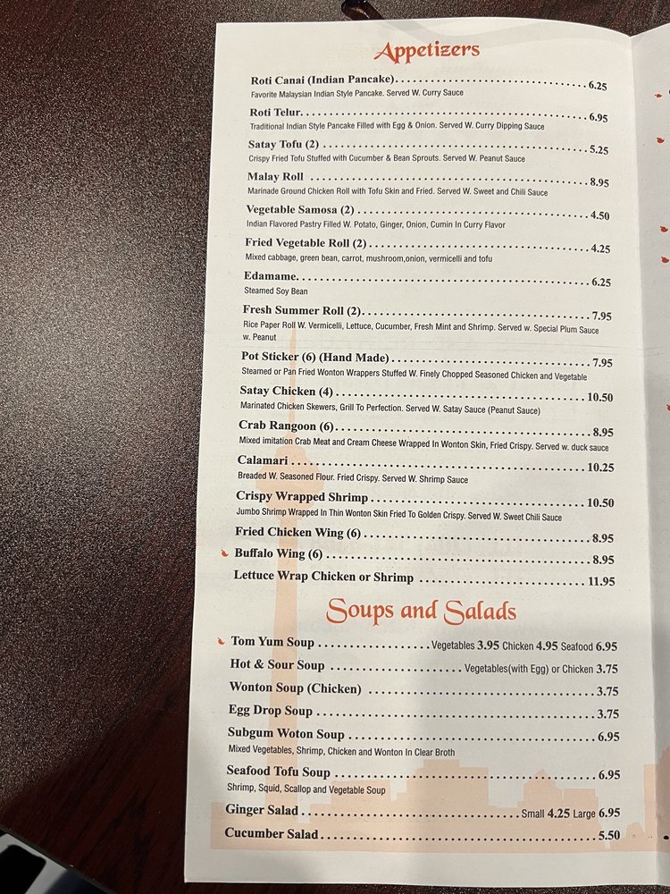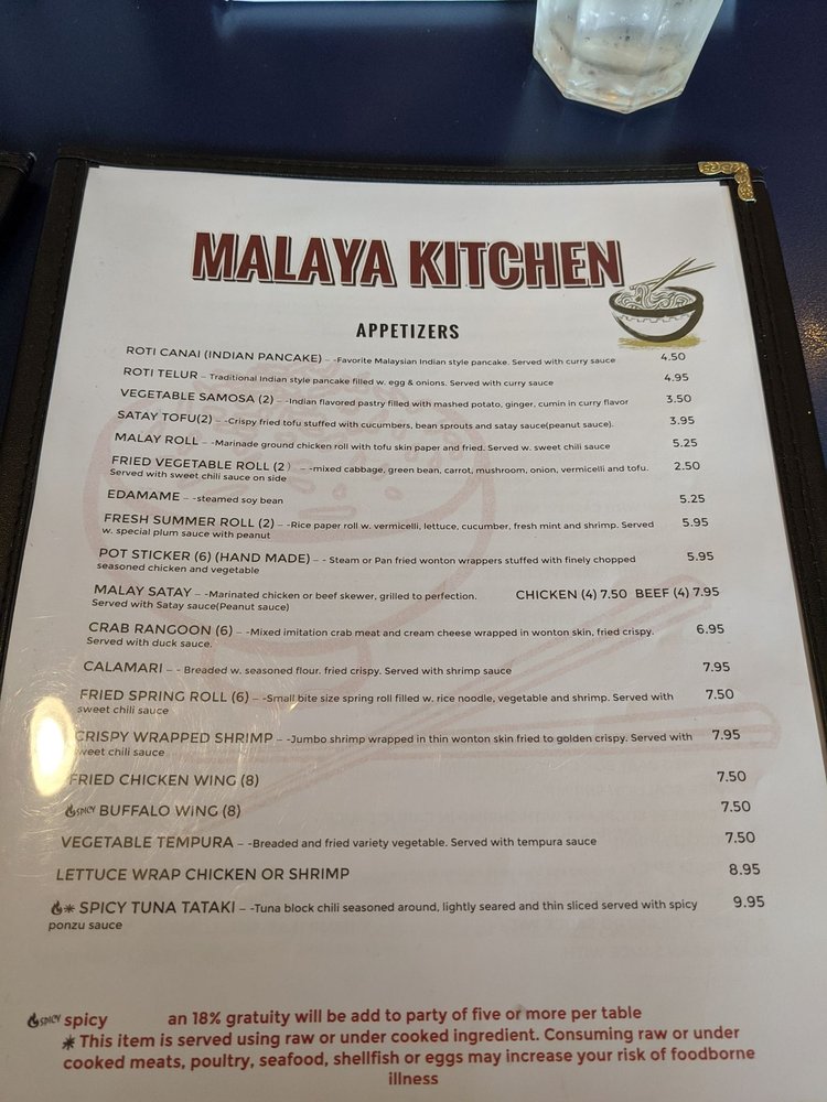 Malaya Kitchen is a cozy restaurant in Charlotte, NC, known for its flavorful and diverse menu of Malaysian cuisine. Offering a variety of lunch entrees, appetizers, soups, salads, and more, Malaya Kitchen provides options for both vegetarians and meat lovers alike. Customer favorites include the Roti Canai, Malay Satay Chicken, and the Crab Rangoon appetizers. The Tom Yum Soup and Seafood Tofu Soup are popular choices for those looking for a flavorful soup option. The restaurant's friendly and attentive service, along with its casual and quiet atmosphere, make it a great spot for gatherings with friends or a relaxing meal. Whether you're a fan of spicy dishes or prefer something milder, Malaya Kitchen has something for everyone to enjoy. Your visit to Malaya Kitchen is sure to be a memorable dining experience.